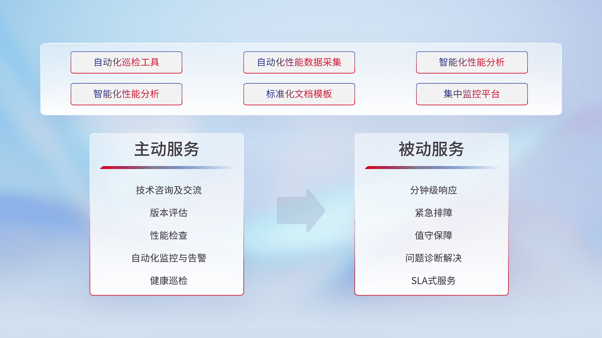 智能化工具和标准化文档,,保障服务质量,,,提供主动服务(包含技术咨询、、、版本评估、、性能检查、、、自动化监控与告警、、健康巡检)和被动服务包含(分钟级响应、、、、紧急排障、、、、值守保障、、、问题诊断解决、、、、SLA服务)。。